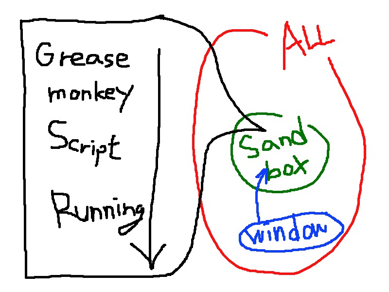赤い線がグローバルスコープ、緑の線がGreasemonkeyスクリプトの走っているSandboxと呼ばれる・・・スコープ・・・スコープでいいのかなぁ・・・にあたります。たとえば今、Greasemonkeyスクリプトの中からSandboxの中で宣言した関数を呼び出して、windowオブジェクトに持たせるとします。図中の青い線がそれです。