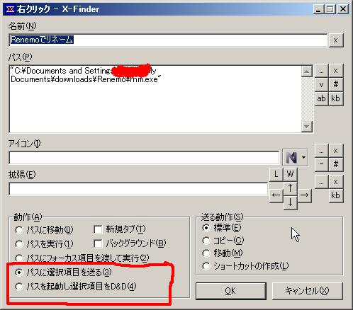 今回やりたいのは、「現在選択されている項目をRenemoで開く」ことなので、パスの欄にRenemoのパスを記述し、動作を3番か4番(4番は11-3以降のみ)に設定します。0番と1番は論外。2番だと一つしか同時に渡せません。