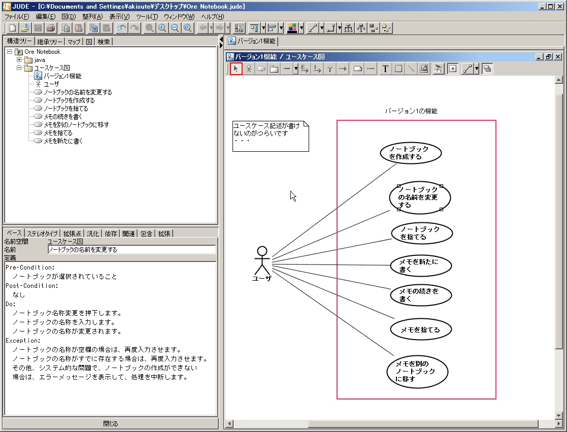 ・・・いえ、メモを選択するという処理の中でノートブックを選択するという処理が必ず行われる、というわけではありません。あくまでこの二つの関係は、先にノートブックを選択しておかなければならないという「前提条件」関係ですよね。というわけでココでは「依存(depandency)」関係を使うことにしました。