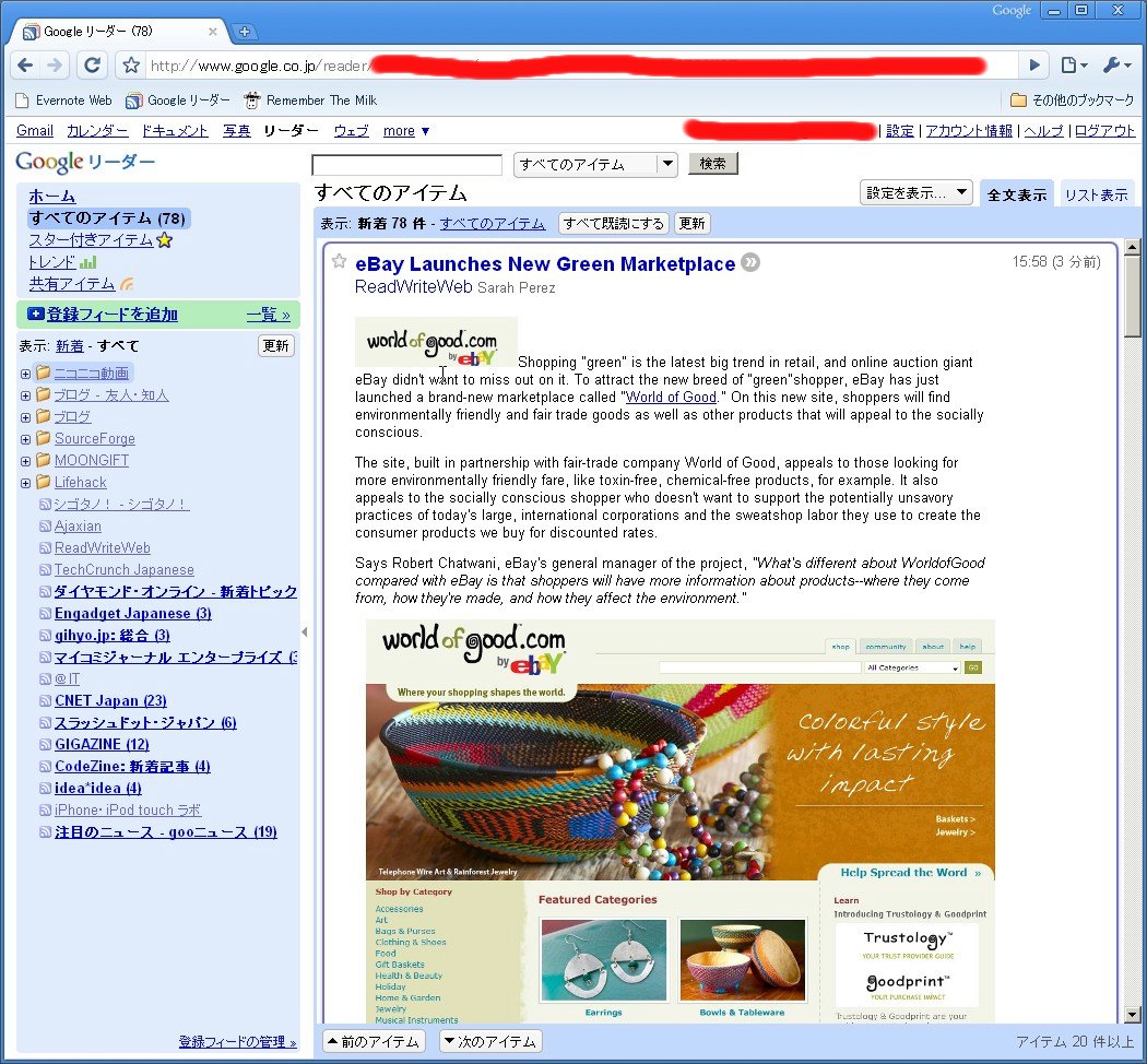 まずはGoogleリーダー。これがもう、驚愕の早さです。Firefox3に初めて乗り換えたとき、あまりのスピードに感動した物ですが、もはやそれが過去の出来事に思えるぐらい速さの次元が違います。なんといいますか、ローカルのテキストエディタでテキストをめくっているぐらい速い。