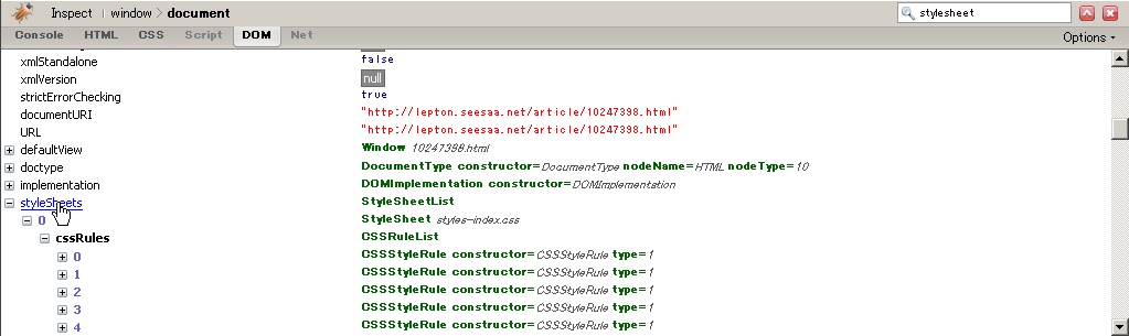 こんな一文が出てきます。CSSを参照しているみたいですが・・・document.styleSheets?Firebugで参照してみると、あ、あった。