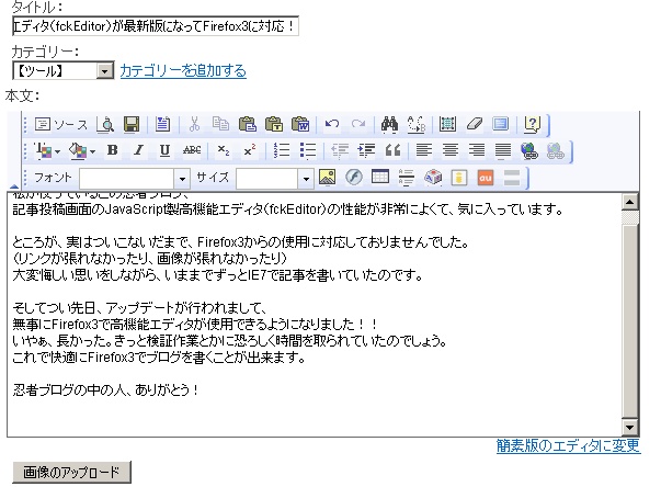 記事投稿画面のJavaScript製高機能エディタ(fckEditor)の性能が非常によくて、気に入っています。