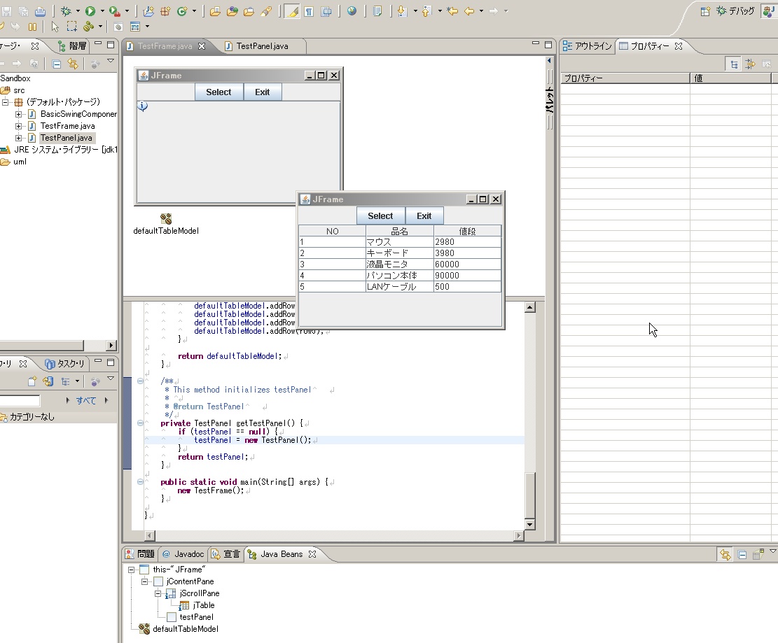 という風に紹介されていましたが、実際には自動的にソースコードには追加されませんでした。Visual Editorのバージョンが異なるからでしょうか?仕方がないので、手動でDefaultTableModelクラスをフィールドに追加して、設定してみました。