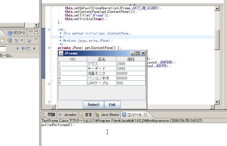 ここでDefaultTableModelを選択し、OKを押すとソースコードにgetDefaultTableModelというメソッドが追加されます。このメソッドで初期化を行います。以下、編集例です。