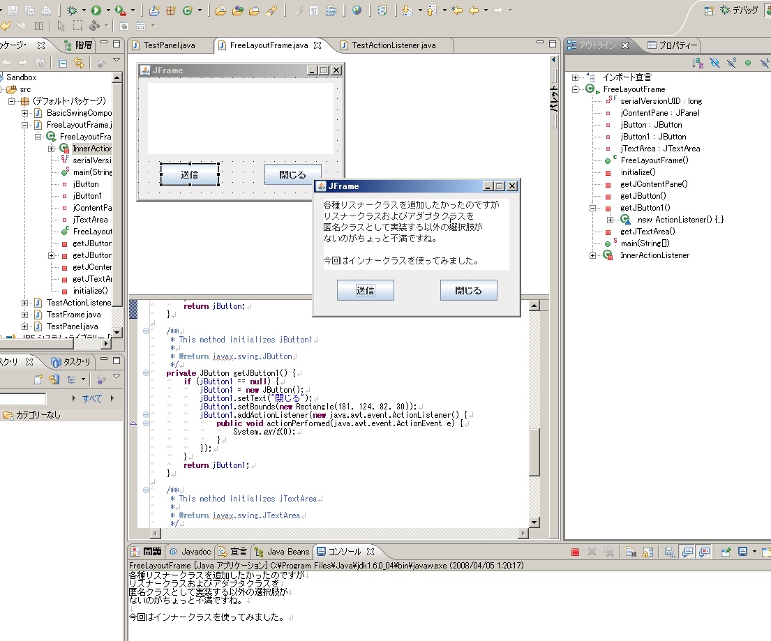このVisual Editorプラグインは、各種GUIコンポーネントを、GetterのみをもつBeanとして扱うような設計になっています。また、各種イベントリスナーは基本的には匿名クラスで実装され、どうしても複雑なことをやりたいときはActionインターフェースを実装して行うという方針。