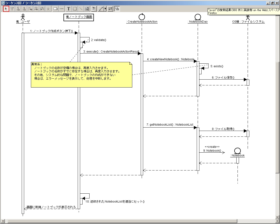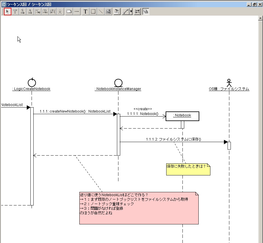前回は概念クラス図&一気にすっとばしてノートブック作成の相互作用図を書いてみました。あまりにもすっ飛ばしすぎたので、一体全体何をやっているのかわからなかった方もいらっしゃると思います。というわけで、図の残りの部分を直しながら、きちんとした解説を行います。