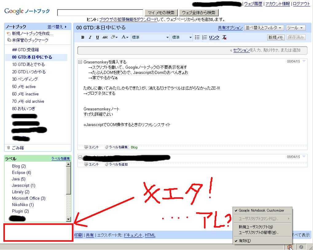 早速Greasemonkeyに装備してGoogleノートブックに行ってみました。
