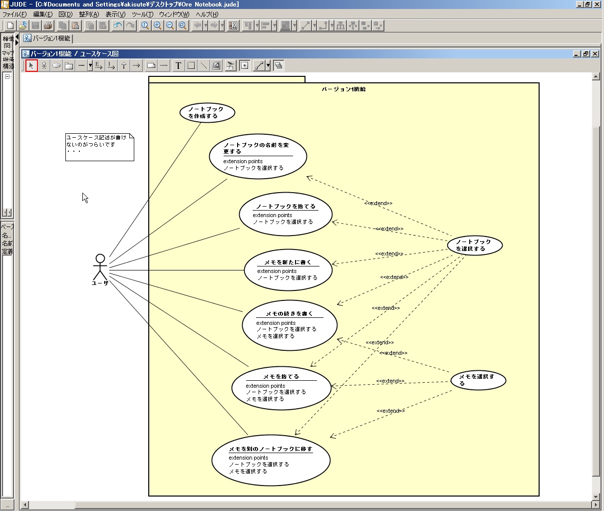 ・・・いえ、メモを選択するという処理の中でノートブックを選択するという処理が必ず行われる、というわけではありません。あくまでこの二つの関係は、先にノートブックを選択しておかなければならないという「前提条件」関係ですよね。というわけでココでは「依存(depandency)」関係を使うことにしました。