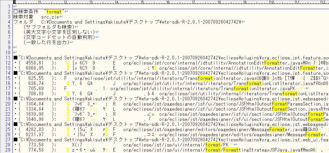 悩んでいても仕方がないので、ダウンロードしてきたソースコードフォルダ全体のsrc.zipファイルに対して、"format"という文字列が含まれていないか、サクラエディタでgrepをかけてみることにしました。